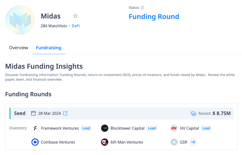 - Funding: Midas concluded seed and early funding rounds totaling approximately $8.5–8.75 million. The details of this funding are available on Bitget, CryptoRank, and the project’s X (Twitter) feed. Hi Framework, Strobe Ventures, GSR, and Coinbase Ventures are among the investors backing the protocol’s funding rounds.