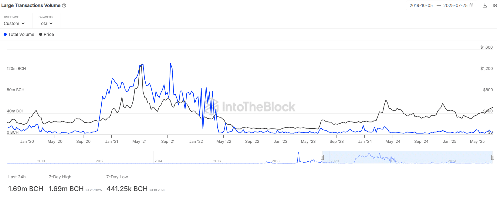 Figures from IntoTheBlock revealed a substantial 97.77% surge in Large Transactions Volume, reaching 1.69 million BCH on July 25th. This uptick signifies heightened activity from large holders and institutional investors.