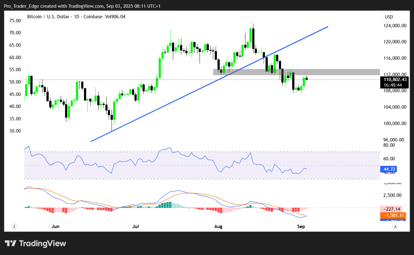 - Bitcoin’s value experiences a 3% upswing, recovering to $110,000 after testing a support level of $107,300.