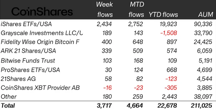 The latest weekly inflows were distributed widely among various US-based issuers, with BlackRock’s iShares crypto funds leading the way by attracting $2.4 billion.