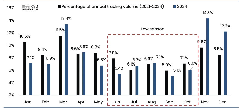 Looking forward, K33 Research highlights that spot trading volumes generally decrease from June