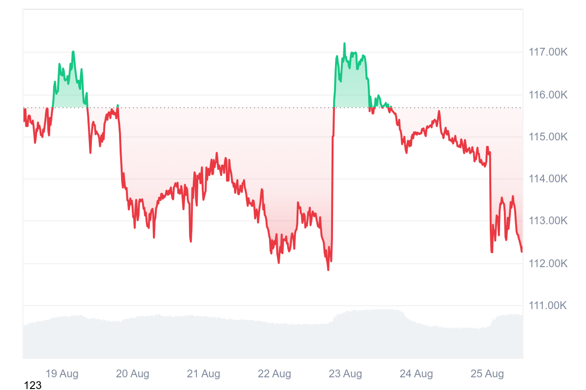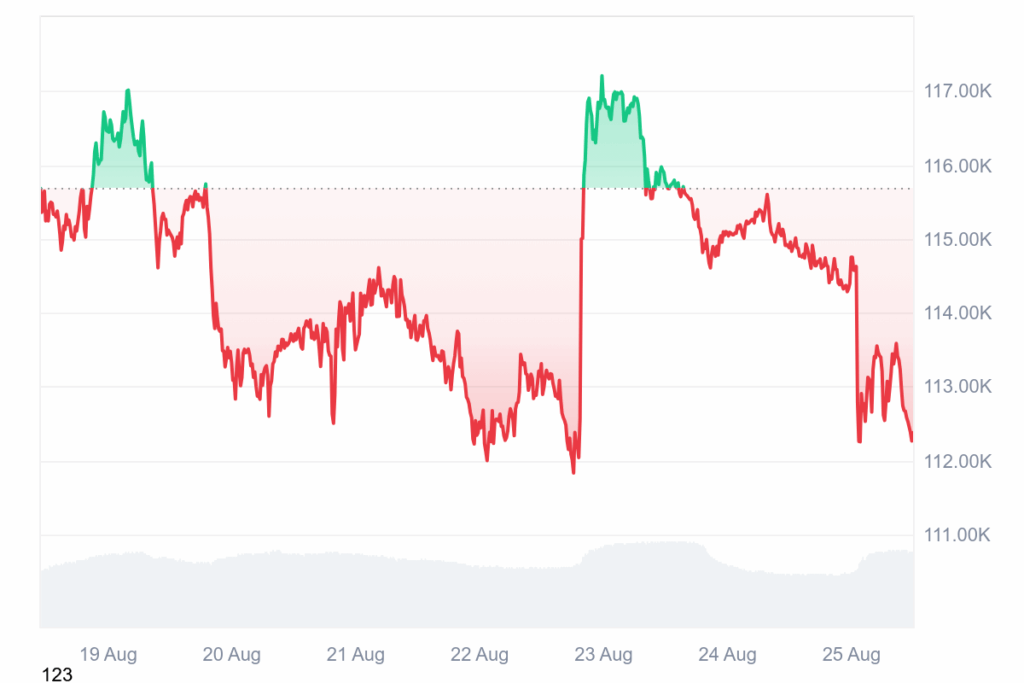 Despite an initial optimistic reaction to Jerome Powell’s speech at Jackson Hole, Bitcoin’s price experienced a sharp decline late Sunday. With a 2.5% decrease over the past 24 hours, Bitcoin is currently trading around $111,800, holding a market capitalization of $2.22 trillion.