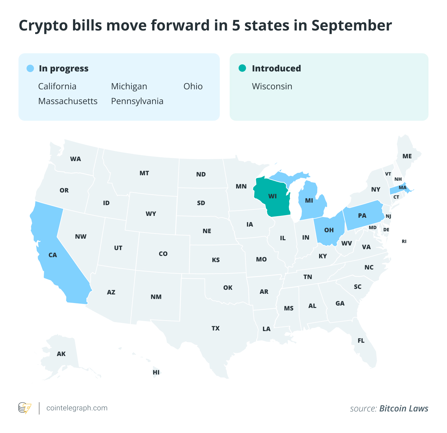 As the adoption of cryptocurrencies continues to expand within the United States, individual states are increasingly taking the initiative to regulate the industry. Crypto-related bills progressed through legislative processes in five states during September, and Wisconsin introduced a new bill.