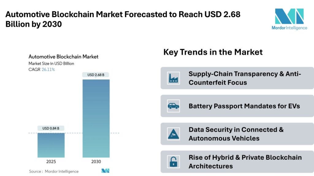The automotive blockchain space is moving towards a more established phase, driven by practical applications, including supply chain transparency, EV battery tracking, and secure data sharing in modern vehicles. The projected growth, from approximately $0.84 billion (USD) in 2025 to $2.68 billion (USD) by 2030, highlights strong underlying demand.