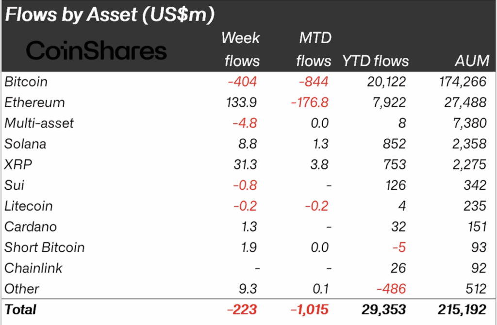 According to a CoinShares report published on Monday, crypto investment products saw more withdrawals than deposits overall, with Bitcoin leading the way at $404 million. In total, digital asset investment vehicles experienced net outflows of $223 million during the week.