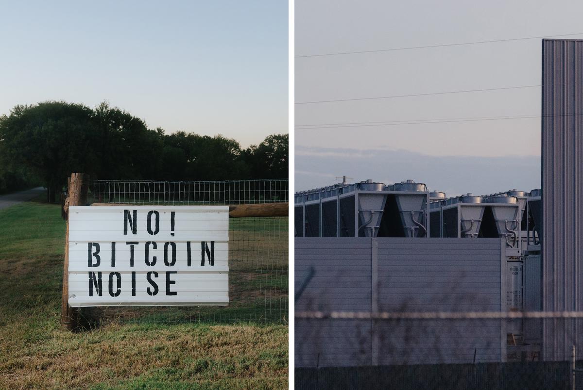 Left: Cheryl Shadden has signs placed around her property protesting the noise generated from Marathon’s cryptocurrency facility in Hood County. Right: Residents say the 24-foot-tall soundproofing wall has done little to reduce “the roar,” the hum generated by fans cooling the cryptomining computers.