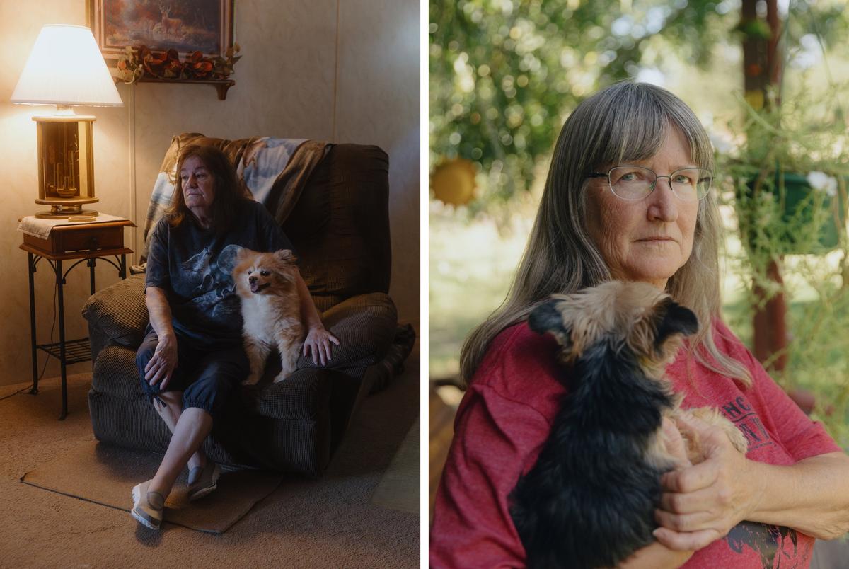 Left: Geraldine Lathers at her home with her dog, Gizzmo. Due to the noise from the neighboring Marathon cryptocurrency facility, Lathers said she takes Vitamin D pills instead of going outside, and her great grandkids don’t come to visit as much. Right: Donna Adair sits on her porch swing with her dog, Lily. Adair says she misses being able to read on her porch in peace without the noise from the neighboring Marathon cryptocurrency facility.