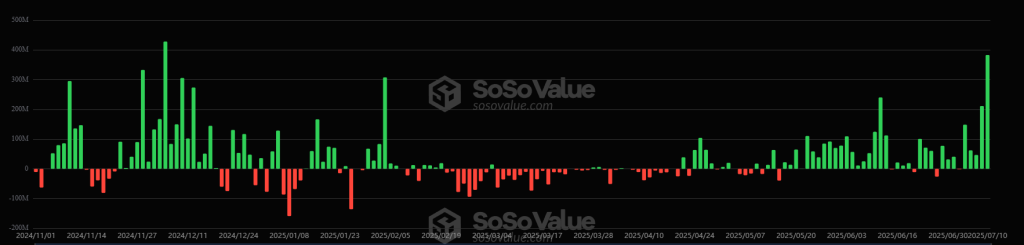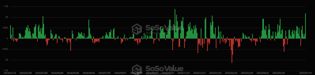 Furthermore, on July 10, US Bitcoin spot exchange-traded funds (ETFs) experienced a massive increase in inflows. The inflows totaled $1.18 billion, compared to $218.04 million on July 9. This is the second-highest amount ever recorded, only surpassed by the $1.38 billion seen in November 2024.