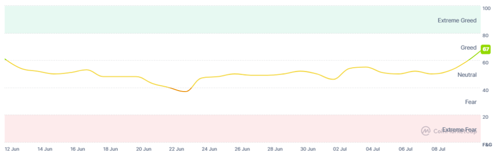 Also, market sentiment in the crypto space has greatly increased and entered a state of greed. The Fear and Greed Index has risen from 58 yesterday to 67 today, reaching its highest level in a month.