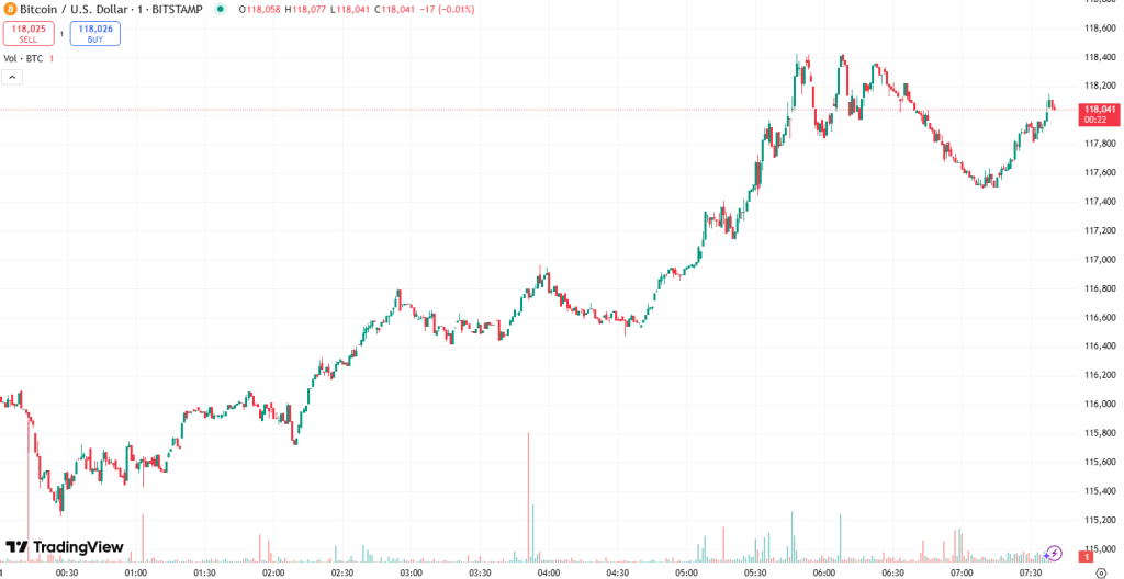 At the time of this article, Bitcoin is trading at $117,586. It reached a new all-time high of $118,254 just an hour prior to this article. This surge followed a drop to an intraday low of $98,974. The price has increased by 8.1% over the past week, 7.6% over the last month, and 103% over the past year.