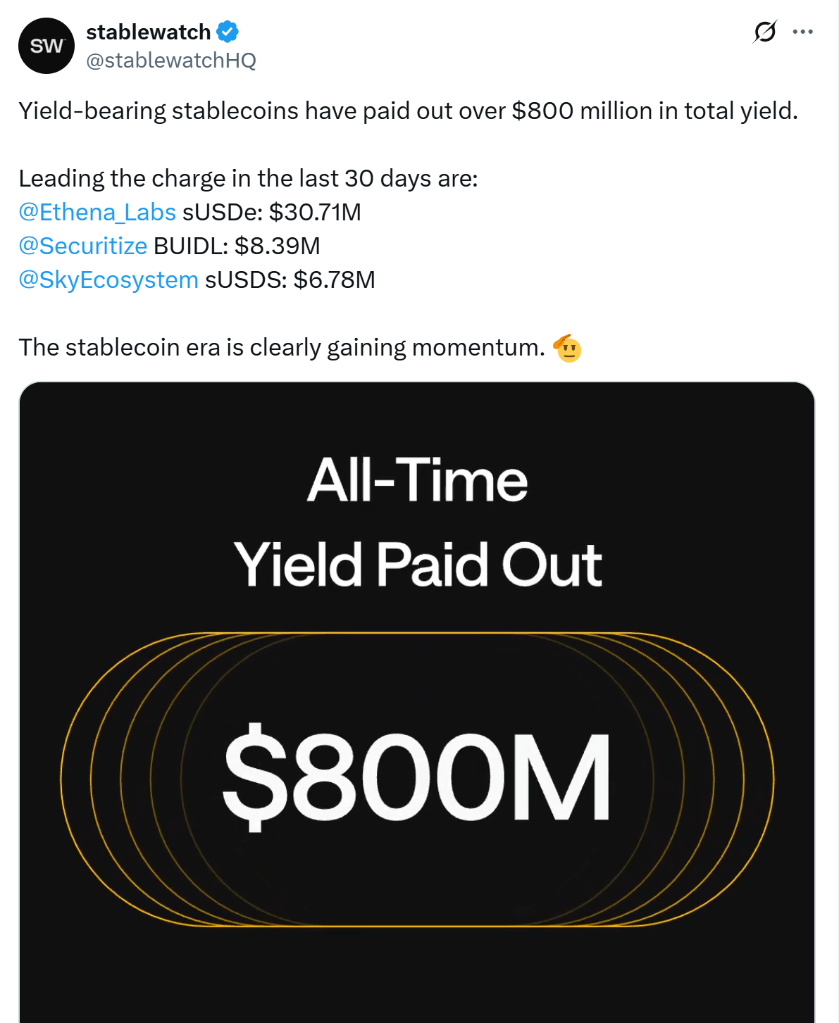 StableWatch recently reported that yield-generating stablecoins have paid out over $800 million in aggregate returns to holders. Ethena Staked USDe (sUSDe) topped the payout charts over the past month, with $30.71 million, followed by Securitize’s BUIDL ($8.39 million) and Sky Ecosystem’s staked USDe (sUSDe) ($6.78 million).