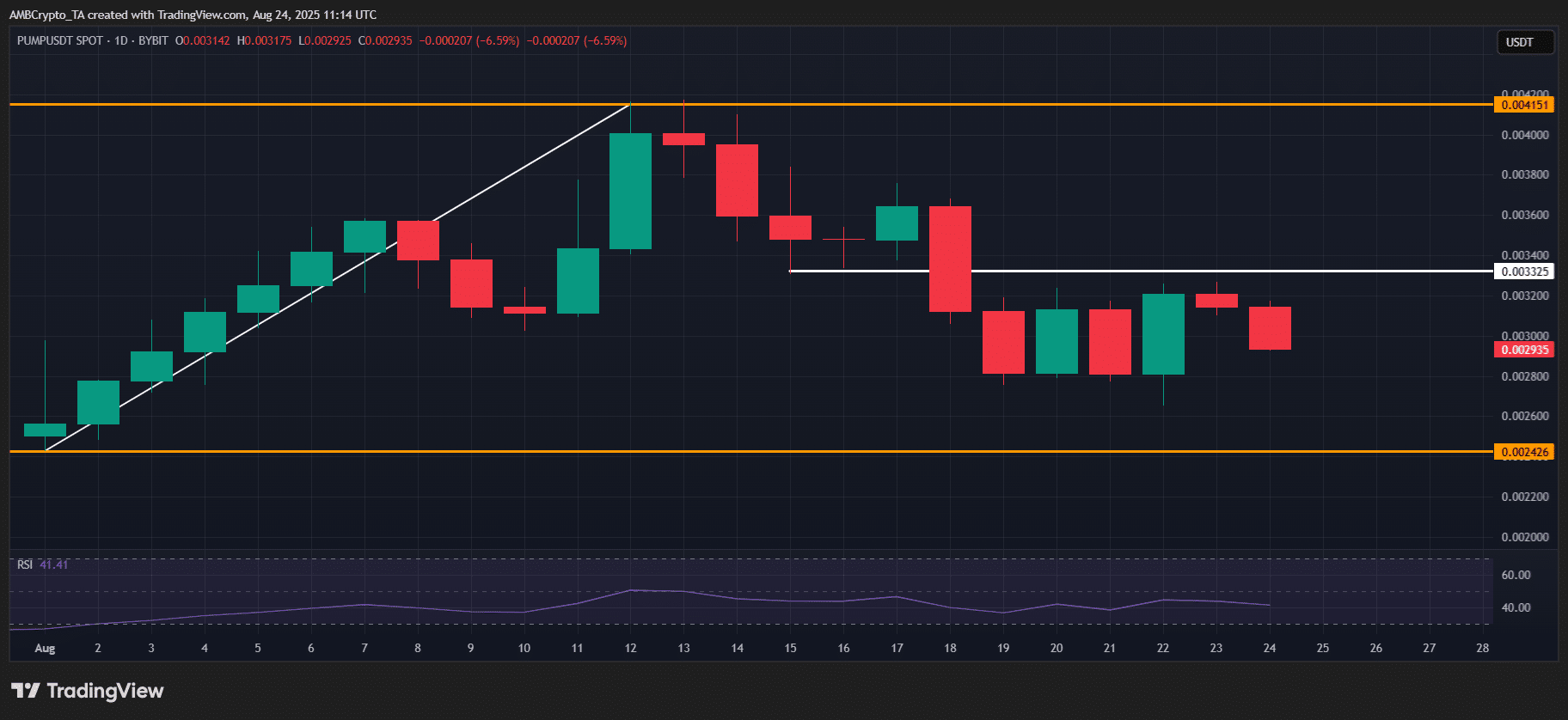If buyers do not defend this zone, a more substantial retracement could target levels from early August around $0.024. Therefore, it is crucial for Pump.fun to stabilize near the $0.03 level, as holding this support could rebuild confidence.