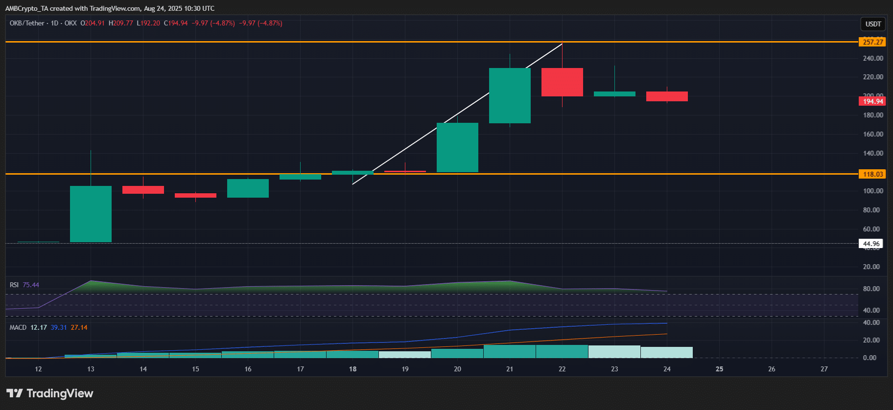 The key question now is whether buyers can sustain these levels or if profit-taking will dominate. OKB has already retreated by about 24% from its recent high, indicating some short-term profit realization.