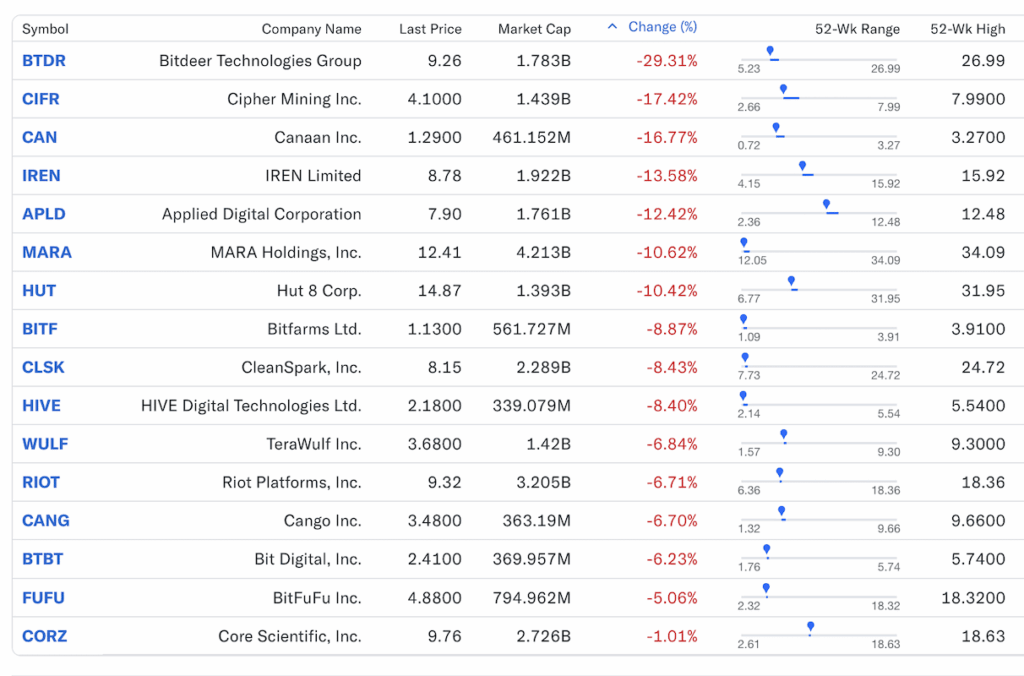 During the preceding month, Hut 8, MARA, Canaan, and Terawulf mirrored Bitdeer’s downward trajectory, each experiencing stock price declines exceeding 30%. Since the local peak observed on January 24th, the market capitalization of both Hut 8 and Terawulf has diminished by more than 40%.