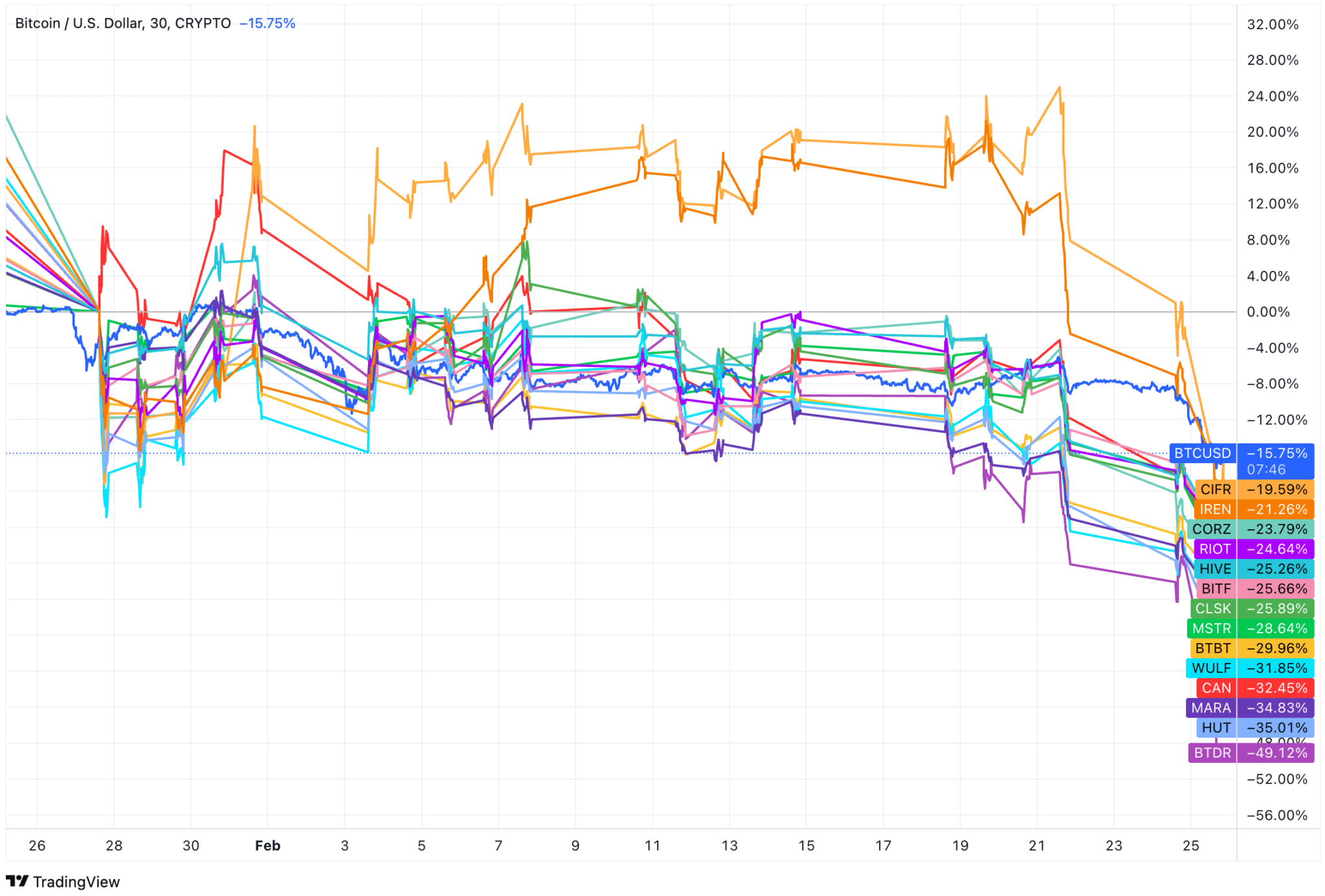 Shares of Bitcoin mining operations are suffering because of turbulence in the overall cryptocurrency market in conjunction with a wider correction observed in the Nasdaq stock exchange. According to data compiled by TheMinerMag, the collective market cap of 15 publicly listed mining firms fell to $23.2 billion by February 25th, a considerable decrease from a high of $36.6 billion reached on January 24th.