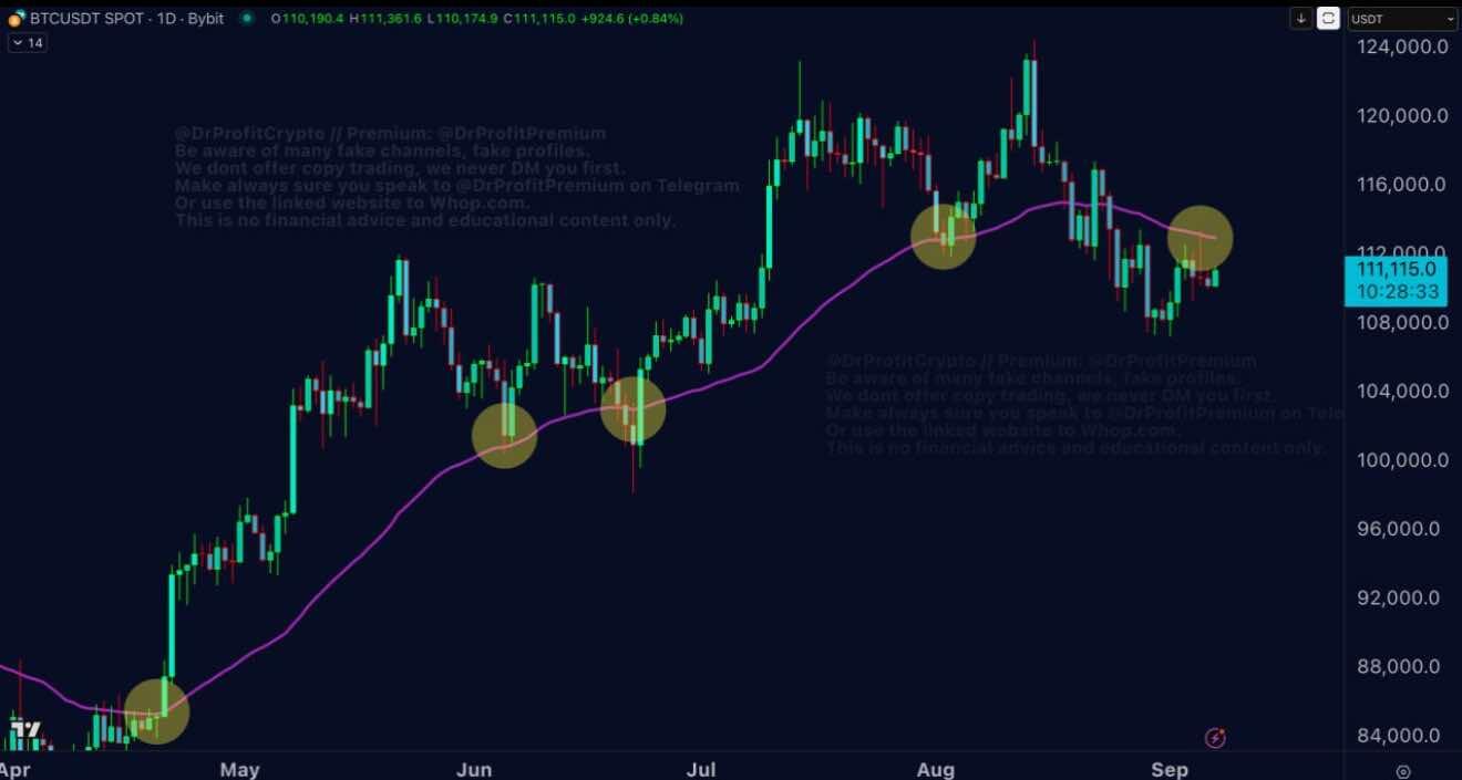 The 50-day Exponential Moving Average (EMA50) is frequently regarded as a crucial support indicator by many cryptocurrency analysts. The pattern has historically proven reliable. Throughout June, July, and August, the market repeatedly tested this line, consistently rebounding thereafter. However, in September, this key level has been breached and retested, transforming what was previously a strong support level into a resistance point. Currently, the EMA50 is acting as a significant resistance barrier, suggesting a potentially substantial price correction, potentially ranging from 15% to 25%, is on the horizon.