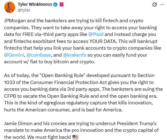 Gemini’s co-founder, Tyler Winklevoss, asserts that JPMorgan’s newly introduced fees will significantly hinder the growth of cryptocurrency and other fintech companies while compromising consumer rights.