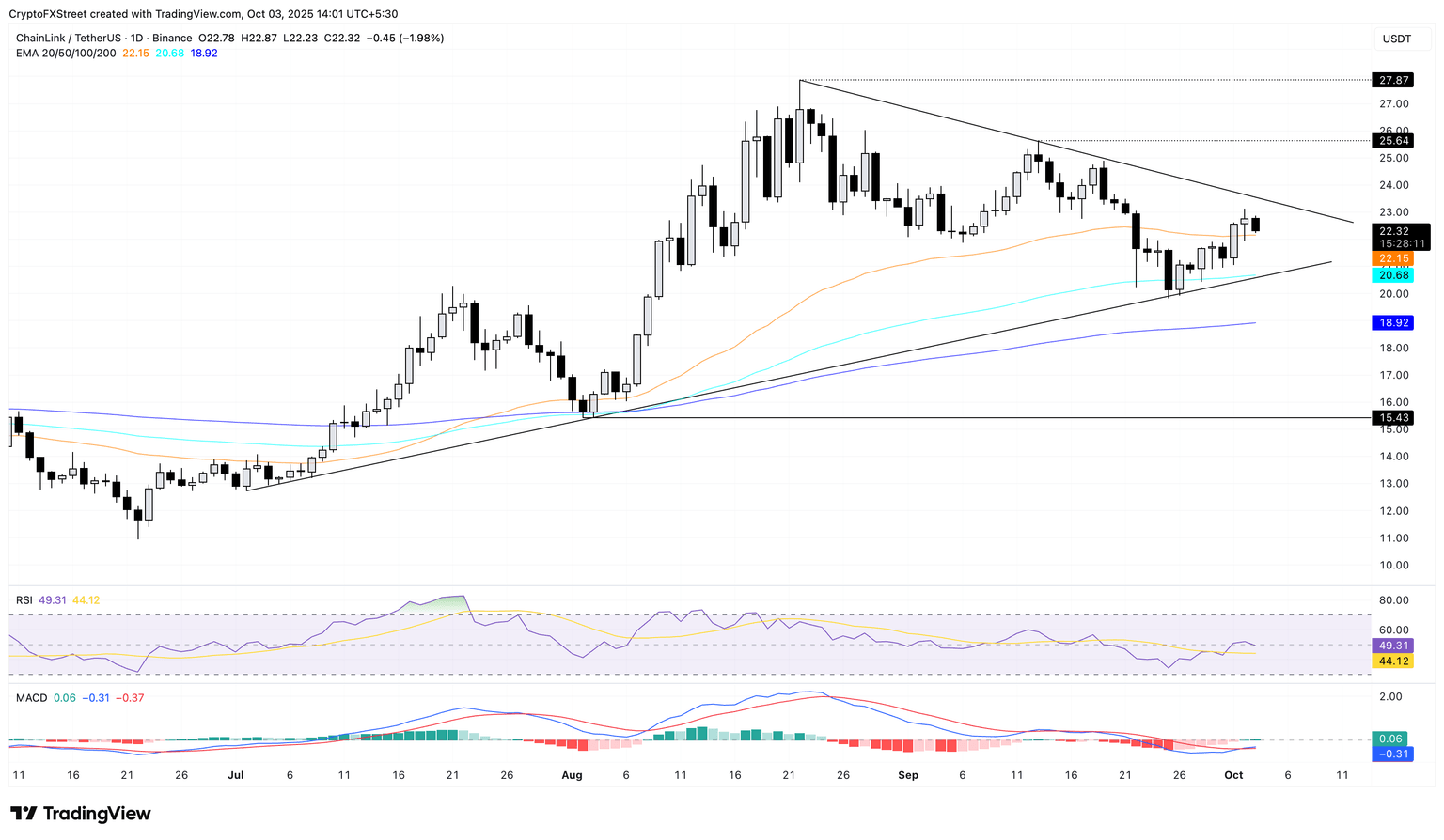 As of Friday’s press time, Chainlink is trading down by approximately 2%, approaching its 50-day EMA around $22.15 after consecutive positive trading sessions. This movement introduces the possibility of an earlier-than-expected downturn within the larger symmetrical triangle pattern visible on the daily price chart.