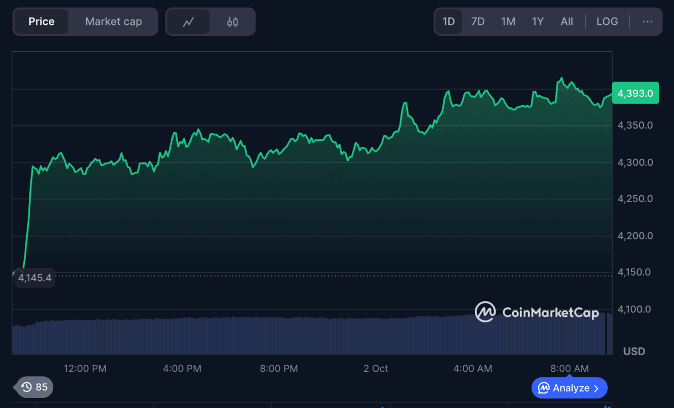 is showing strong performance, with its price increasing by 5.39% to around $4,389.