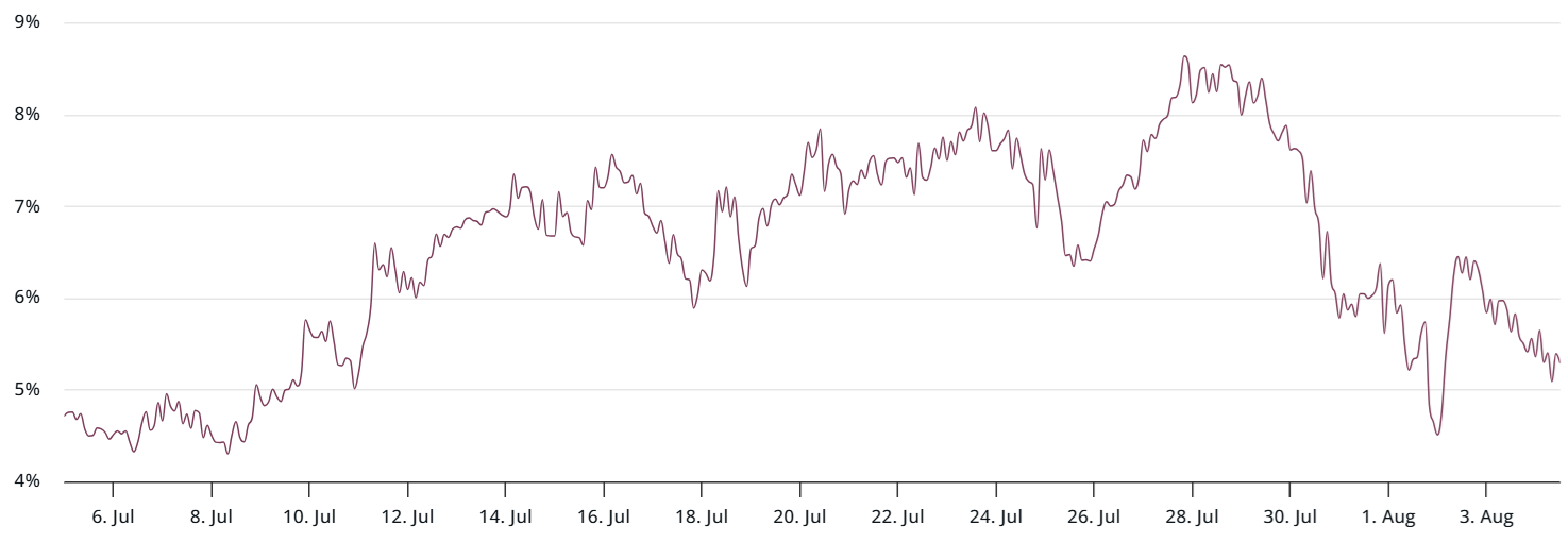 Ether prices on Coinbase and Kraken are trading at a slight discount compared to Binance and Bitfinex, possibly indicating weaker demand from larger, institutional investors. This contrasts with the period between July 10 and July 23, when price premiums likely indicated companies were acquiring capital to increase their ETH holdings.