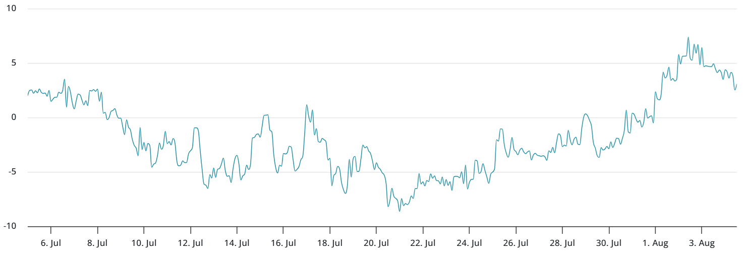 The skew value rises when demand for protective put (sell) options diminishes. The current reading of 3% suggests a balanced view of risk, indicating that bullish sentiment has not yet returned.