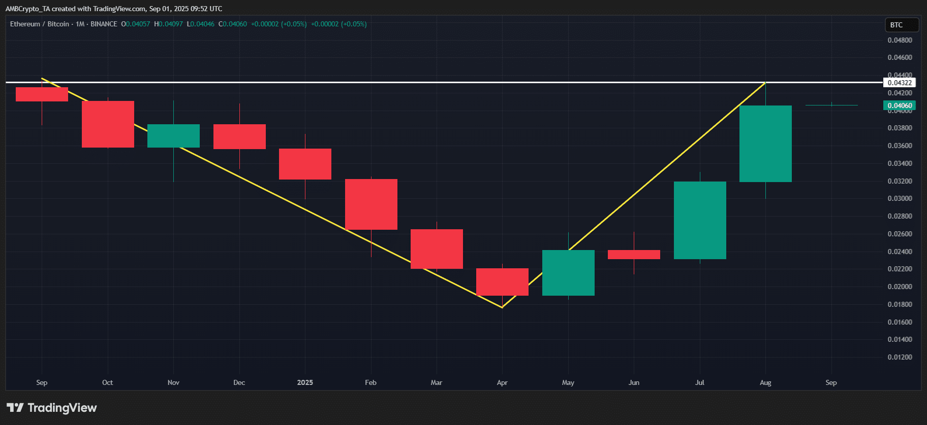 Ethereum’s superior performance is closely linked to the ETH/BTC ratio. This ratio increased by 27.05% in August, starting from 0.031.