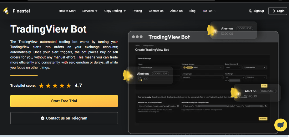 The Finestel TradingView bot establishes a fluid connection with TradingView, transforming PineScript strategies, technical indicators, and personalized alerts into active trades. Supporting major exchanges like Binance, Bybit, KuCoin, OKX, and Gate, with planned integrations for Bitget and Coinbase, the bot is capable of managing up to 200 trading pairs concurrently. Traders can define precise parameters such as entry points, stop-loss levels, take-profit targets, and risk allocation limits, ensuring accurate execution and minimizing the need for constant market observation. Setting it up is straightforward: simply configure a TradingView alert, copy and paste Finestel’s webhook URL, and link your exchange accounts via secure APIs—enabling full automation in less than five minutes, even for novice users.
