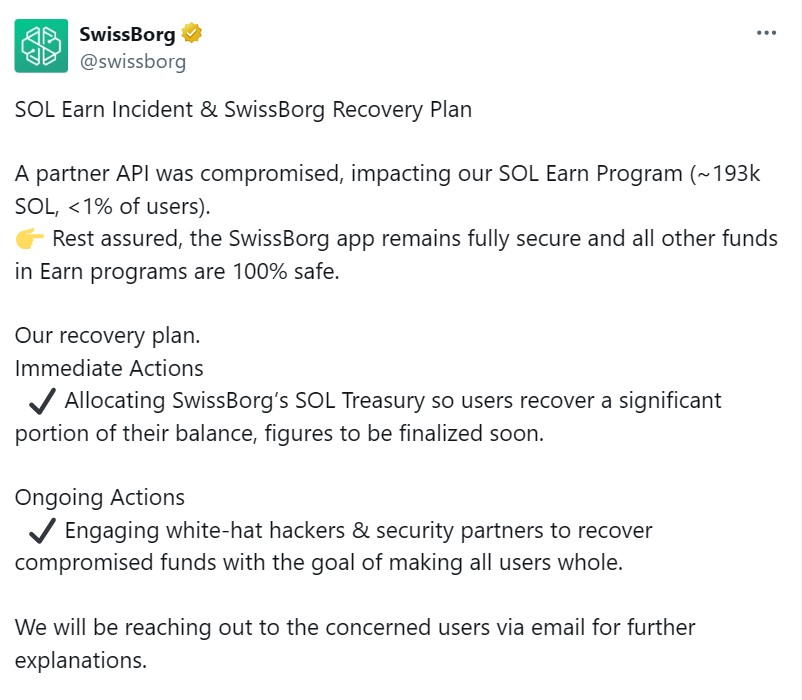 The company confirmed that about 193,000 Solana (SOL) tokens, valued at $41 million, were taken from its “Earn” program. However, SwissBorg assured users that its core application and other “Earn” products remained secure and unaffected.