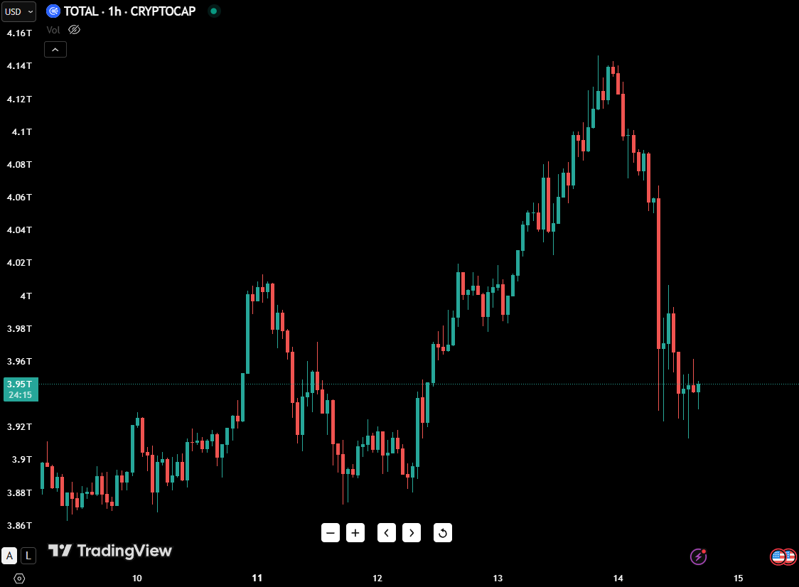 The total cryptocurrency market capitalization has decreased by approximately $119 billion within just five hours of the PPI report’s release. The market is currently valued at $3.94 trillion, a decrease from yesterday’s $4.14 trillion.