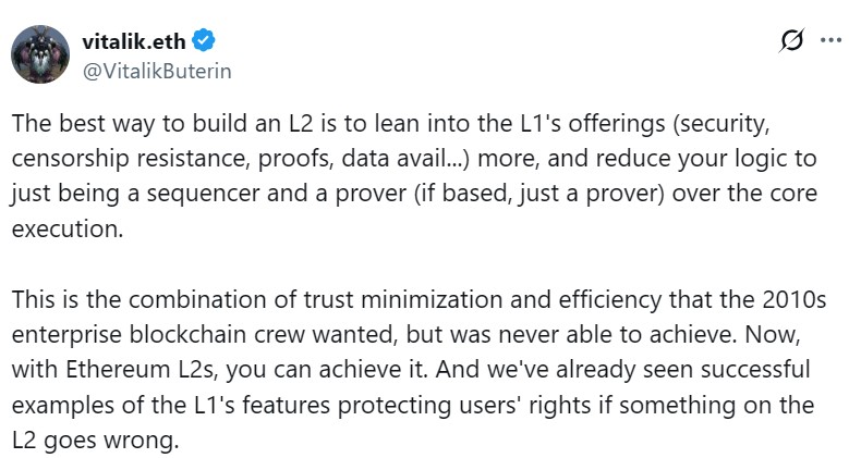 Buterin expanded on the idea, asserting that the optimal method for developing a layer-2 solution is to fully leverage Ethereum’s inherent strengths, including its security infrastructure, data availability, and resistance to censorship.