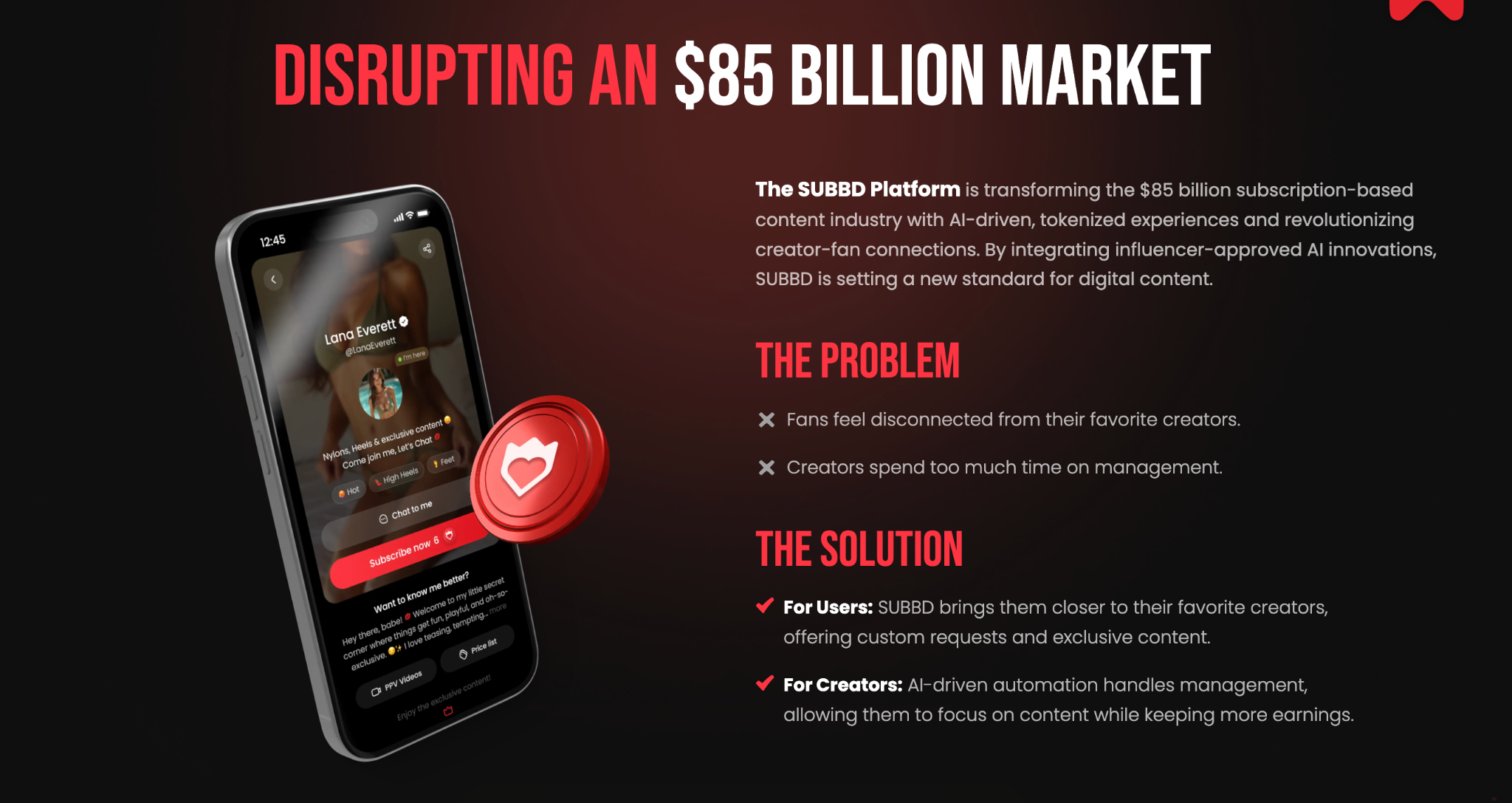 The project also stands out through its AI creators: fully customizable, AI-powered personalities that users can launch to generate income without the need for live appearances. This functionality enables people to tap into the expansive $85 billion subscription content market, which has the potential to drive considerable demand for SUBBD.