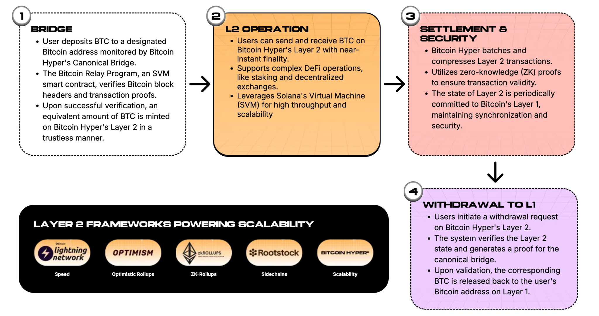 Bitcoin Hyper represents a Layer 2 Bitcoin blockchain leveraging the Solana Virtual Machine (SVM) and ZK-rollups. It processes transactions using an SVM execution layer, while periodically reporting its status to Bitcoin’s core blockchain using ZK-rollups.