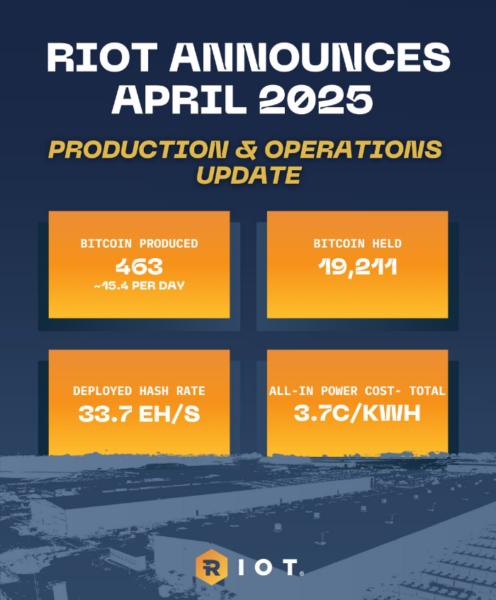 Riot Announces April 2025 Production and Operations Updates.