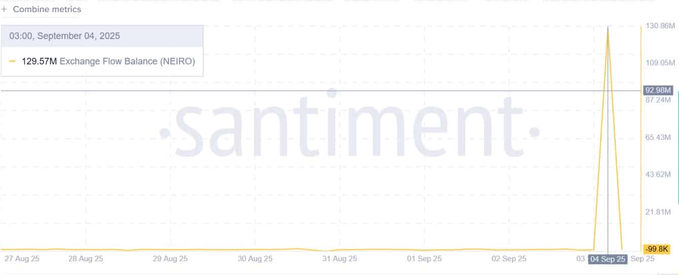 This resulted in a negative Sell-Buy Delta of -379.16 million, reflecting strong selling pressure. Data on exchange activity mirrors this trend. On September 4th, NEIRO’s Exchange Flow Balance reached 129.57 million, indicating a significant increase in tokens flowing into exchanges, presumably for sale.
