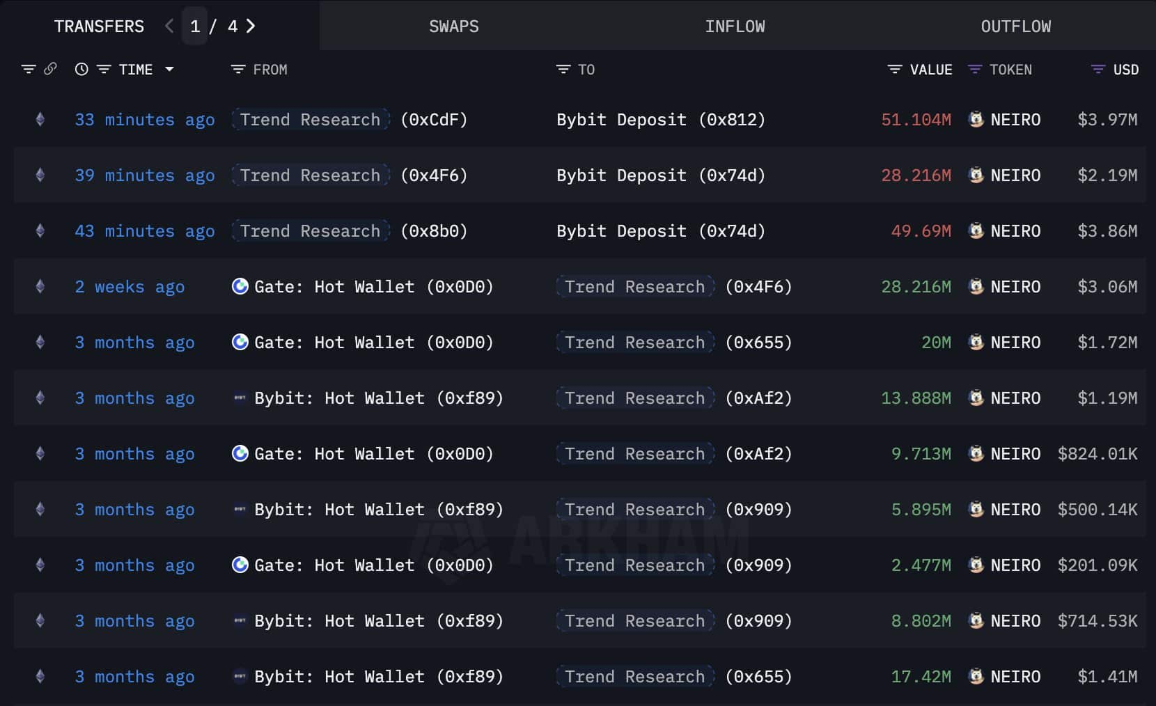 According to information shared by Lookonchain on X, Trend Research, the entity holding the lion’s share of NEIRO tokens, has resumed selling activity. They deposited 129 million NEIRO tokens, worth an estimated $10 million, onto the Bybit exchange.