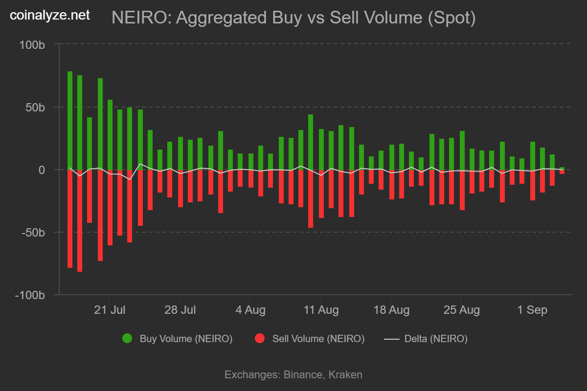 NEIRO is experiencing widespread selling activity across all investor segments. Data from Coinalyze indicates significant sell volume exceeding buy volume. $2.85 billion in NEIRO tokens were sold, compared to $2.47 billion bought.