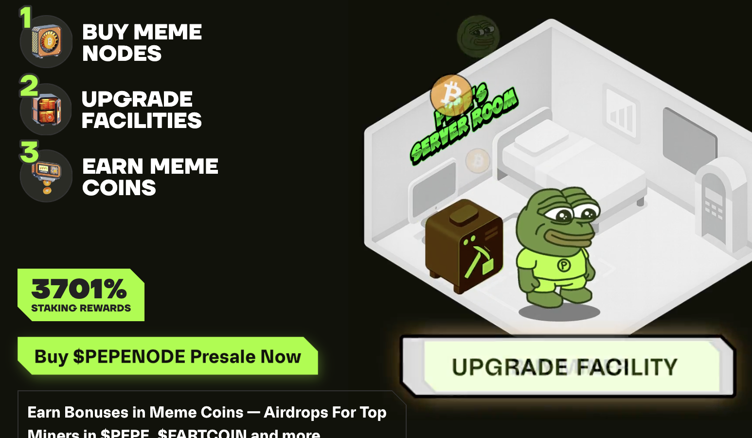 Facilities can be upgraded to boost mining performance. Significantly, about 70% of the tokens used for upgrades are permanently removed from circulation, creating long-term scarcity and supporting the value of $PEPENODE.