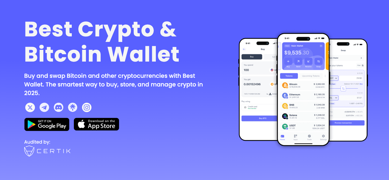 Best Wallet is a comprehensive crypto wallet application offering a no-KYC (Know Your Customer) approach. It supports over 60 blockchains (including Solana) and features integrated swaps, staking options, presale access, and portfolio tracking tools. Enhanced security is ensured through two-factor authentication and Fireblocks‘ security infrastructure.