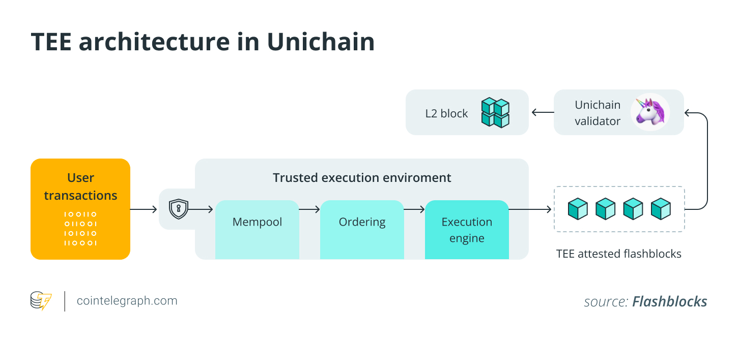 Trusted execution environments can also support MEV-resistant blockchain infrastructure. Unichain, an optimistic rollup on Ethereum, was developed by the Uniswap team and launched in October 2024. It uses TEEs in its block-generation process. The block builder, created with Flashbots, uses TEEs to assemble blocks inside a protected enclave.