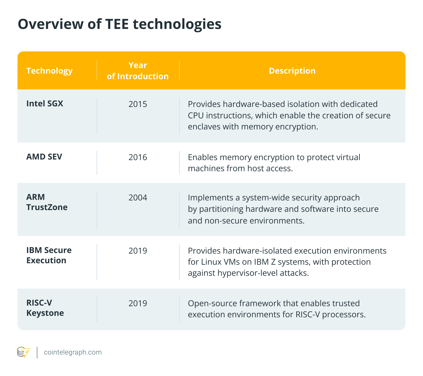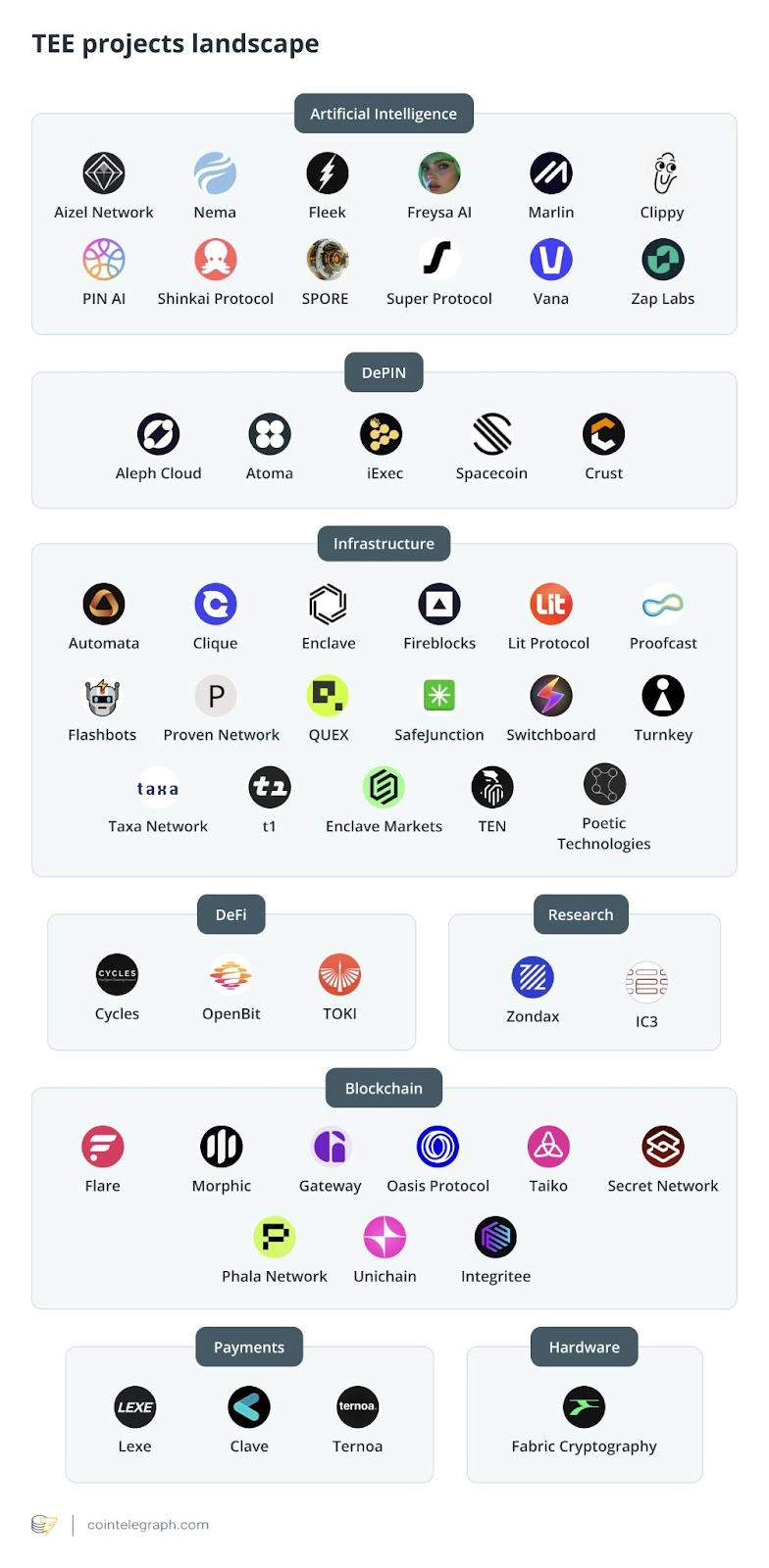 As interest surges in methods to scale and secure blockchain technology, hardware-based approaches are attracting attention. Trusted Execution Environments (TEEs) are increasingly important in blockchain, evolving from simple privacy tools to systems that boost scalability and enable safe off-chain processing. Currently, over 50 development teams are exploring TEE-based blockchain projects. This piece, brought to you by Cointelegraph Research, dives into the underlying tech of TEEs within blockchain environments and explores vital applications of the technology.