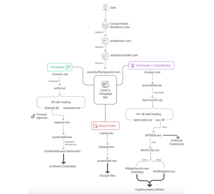A widespread malicious campaign is underway, leveraging over a hundred compromised WordPress websites. This campaign redirects visitors to deceptive CAPTCHA verification pages. These fraudulent pages utilize a social engineering method known as ClickFix, ultimately delivering information-stealing malware, ransomware, and cryptocurrency mining software.