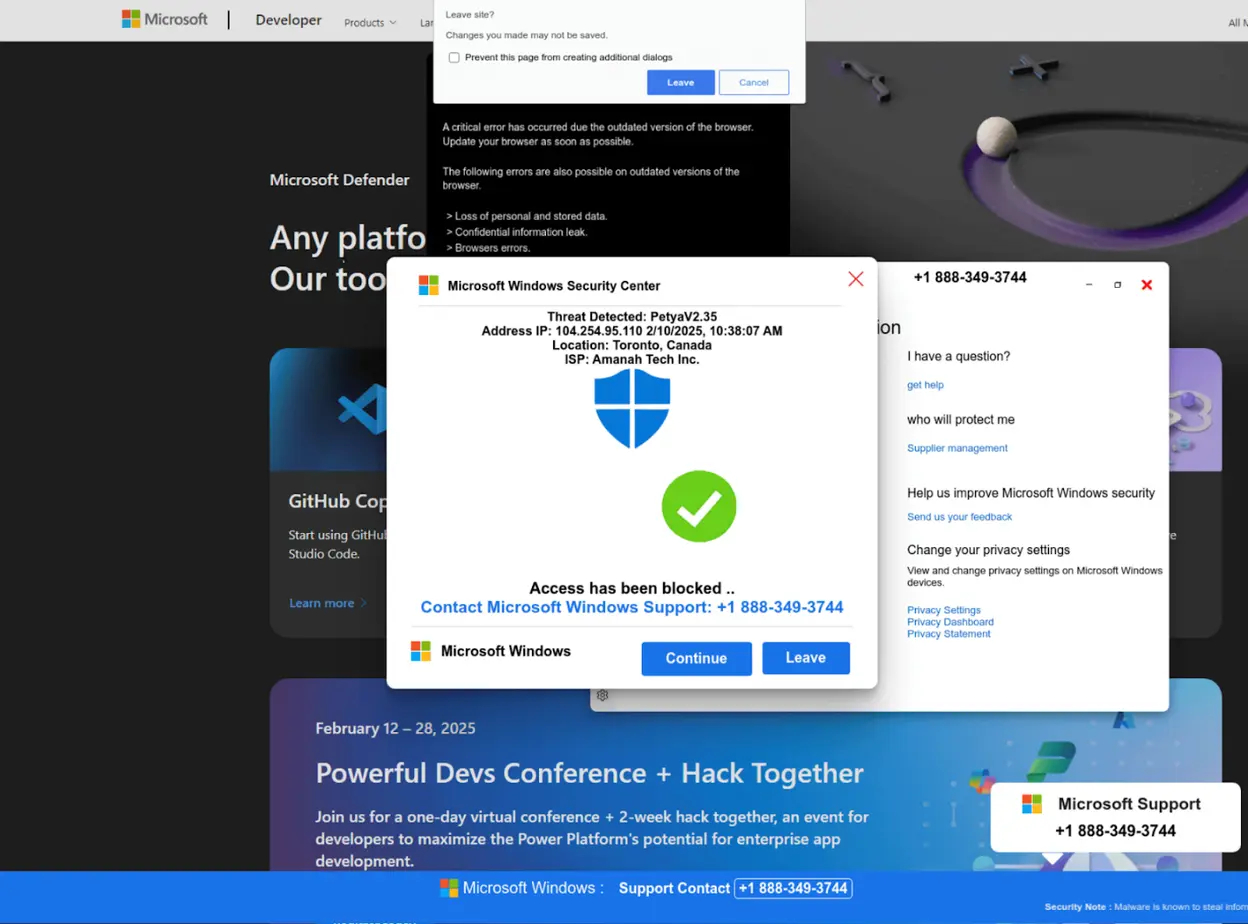 “This operation specializes in tech support scams that utilize full-screen browser manipulation and exit prevention techniques to trap victims on fraudulent Microsoft Windows security alert pages, with alternative monetization strategies involving dating, cryptocurrency, and sweepstakes scams,” explained security researcher Denis Sinegubko from GoDaddy.