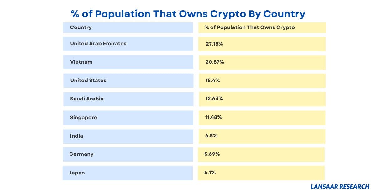 Crypto’s overall metrics, both in aggregate (such as $750 billion held in U.S. wallets) and per capita (like one in three citizens in the Emirates), continue to grow.