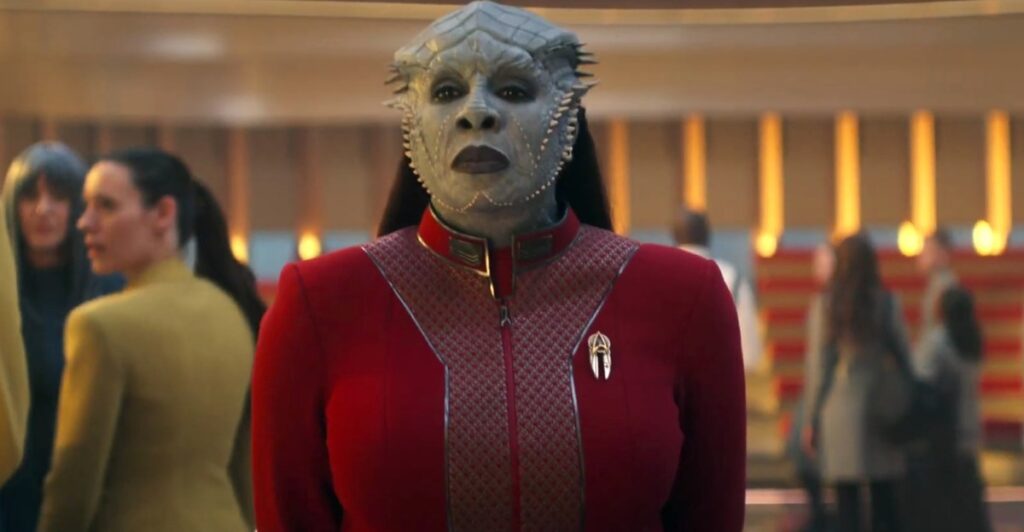A brief glimpse towards the end introduces Commander Lura Thok, played by recurring guest star Gina Yashere. Lura serves as the Chancellor’s First Officer and Cadet Master. In a surprising twist, she is a Klingon-Jem’Hadar hybrid!