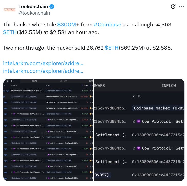 Arkham, a blockchain analysis platform, has identified the wallet as belonging to the “Coinbase hacker,” with Lookonchain alleging that the wallet is connected to thefts totaling over $300 million from Coinbase customers.