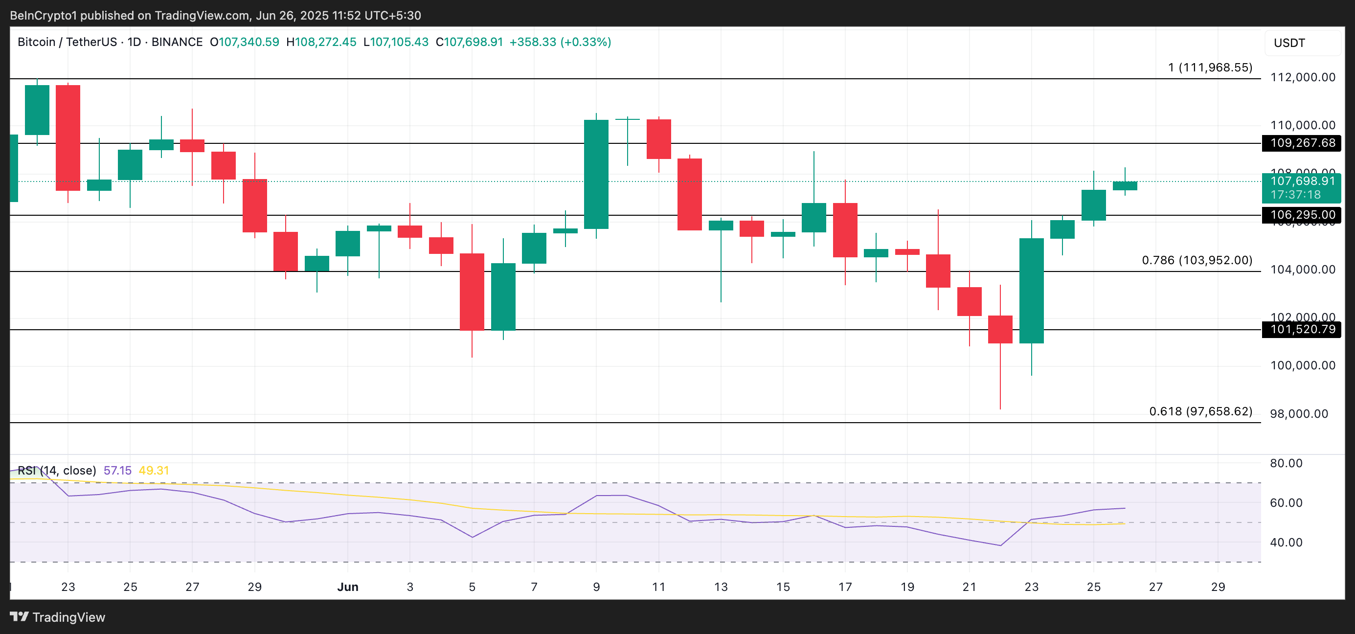 With the RSI at 57.15 and increasing, growing demand for Bitcoin could push its price beyond the $109,267 resistance level, potentially leading to a move towards its all-time high of $111,968.