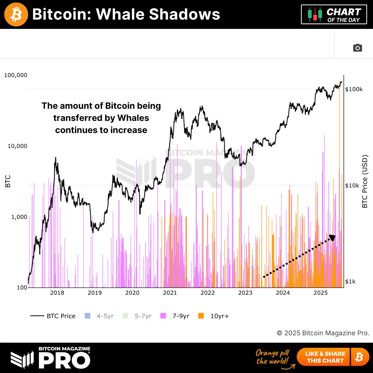 Complementing the accumulation trend, data presented by Bitcoin Magazine Pro also demonstrates a notable increase in large-scale whale transactions. This activity, often referred to as “whale shadows,” tracks movements of Bitcoin held in wallets for extended periods, typically ranging from 4 to over 10 years. The rise in transfer volumes could signify profit-taking strategies, portfolio adjustments, or early indications of redistribution across multiple addresses.