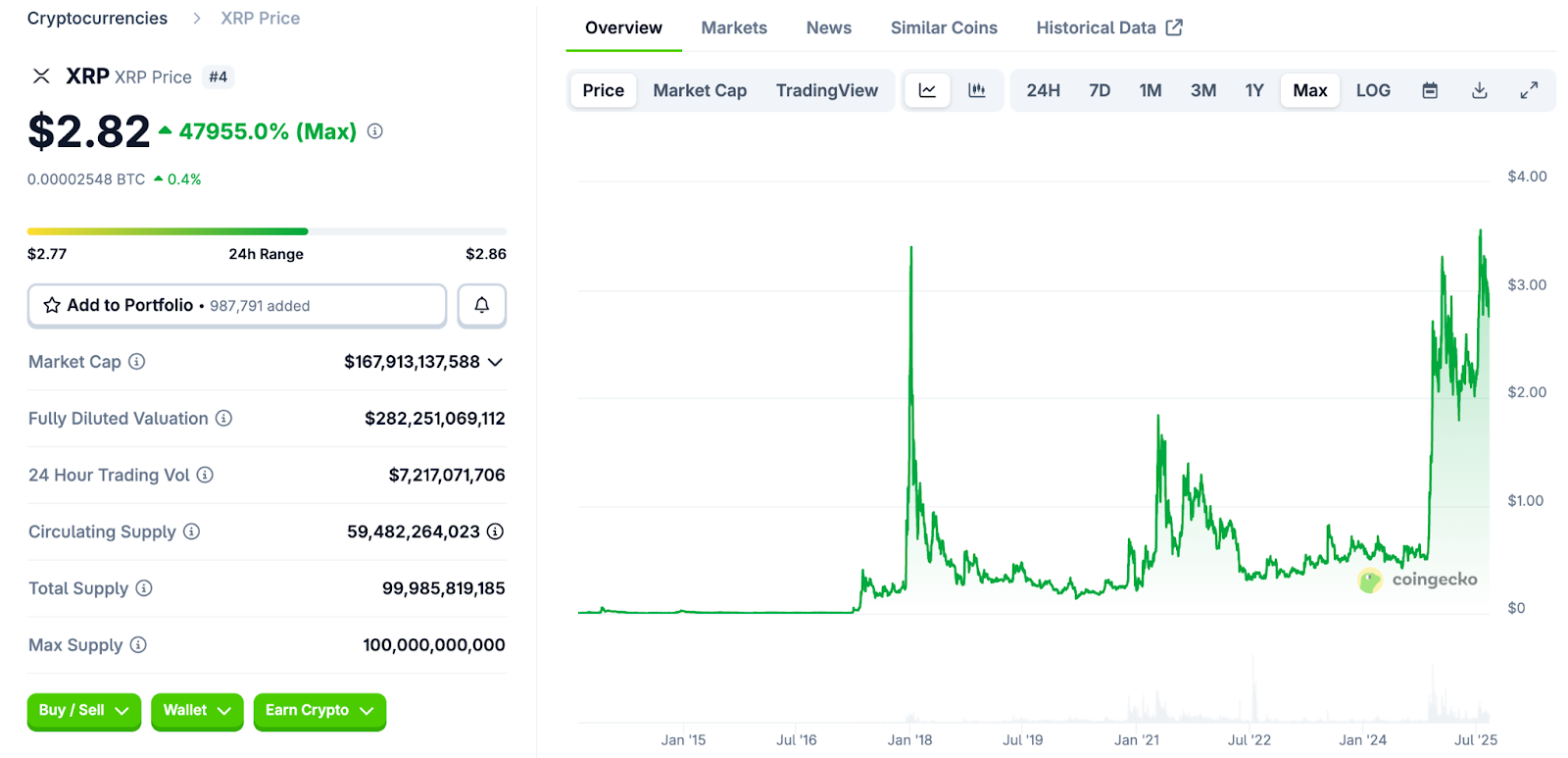 XRP’s all-time high was around $3.65, reached in July 2025.